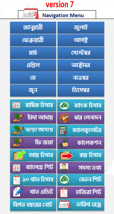 # ভার্সন 5 এ 4 সহ বাড়তি পাওয়া যাবে * ধার আদান-প্রদান হিসাব, কালেকশন হিসাব, বেতন-চাঁদা আদায় হিসাব, আর্ন, কস্ট, ব্যালেন্স শিট।